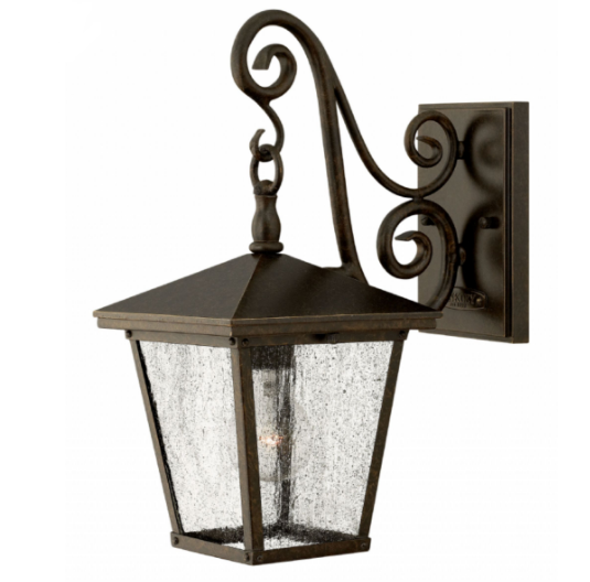 Trellis is a traditional European hanging wall lantern design in an Aged Zinc finish with clear glass or Regency Bronze with clear seedy glass. The large scroll arm detail, cast loop finial and true rivet detail create a refined elegance.