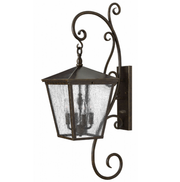 Trellis is a traditional European hanging wall lantern design in an Aged Zinc finish with clear glass or Regency Bronze with clear seedy glass. The large scroll arm detail, cast loop finial and true rivet detail create a refined elegance.
