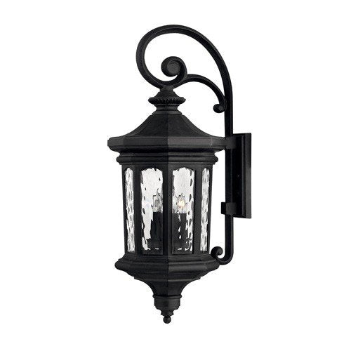 Raley's regal appearance features a bold Museum Black or Oil Rubbed Bronze finish, flourishing details and clear water glass panels for a dignified style statement.