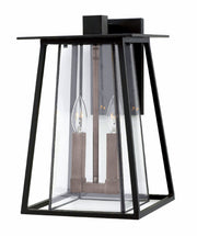 Walker has roots in the American West with its large scale, strong angular lines and no-nonsense style. A welded outer form frames an inner clear, bound glass shade.