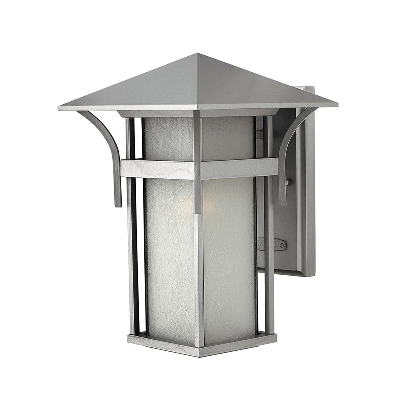Anchor Bronze finish with amber-etched antique seedy glass or titanium finish with translucent inside-sandblasted etched seedy glass.