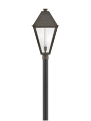 Endsley's stately, modern gas lantern design features an oversized roof with a simple chimney, complemented by tall, clear glass and a painted, artisanal Blackened Brass finish.
