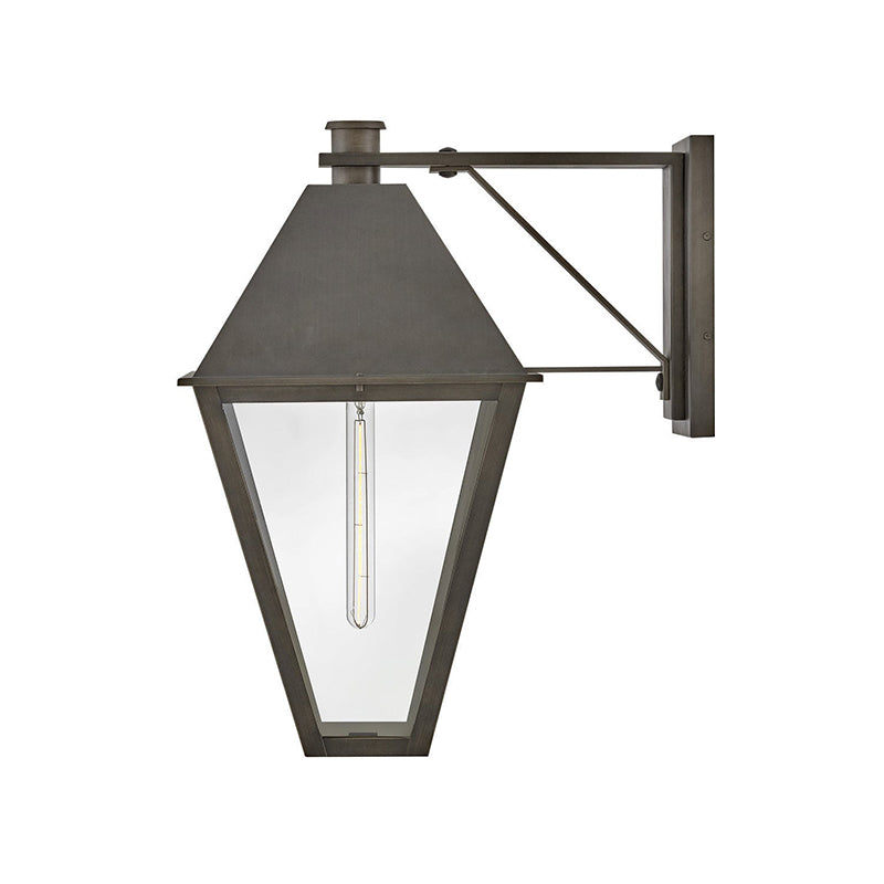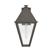 Endsley's stately, modern gas lantern design features an oversized roof with a simple chimney, complemented by tall, clear glass and a painted, artisanal Blackened Brass finish.