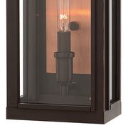 The Sutcliffe collection conveys chic elements of early Americana styling. The candelabra lamping, clear glass and copper reflector infuse this sleek pocket lantern design constructed of solid aluminum with a perfect blend of old and new.