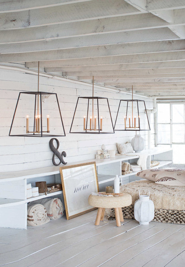 Fulton’s minimalist beauty emphasizes ‘less is more’ with vintage industrial style. This clean, airy tapered cage design is constructed without glass and the unique square candle sleeves rest on a discreet “H”-shaped cluster.