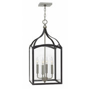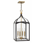 Clarendon is a classic four sided foyer lantern group designed in an elegant two tone finish and constructed in forged iron with cast ball details and clear glass panels. Clarendon is updated tradition at its finest.