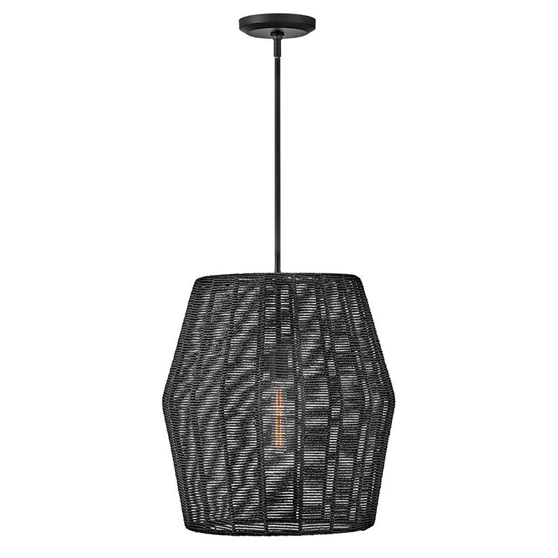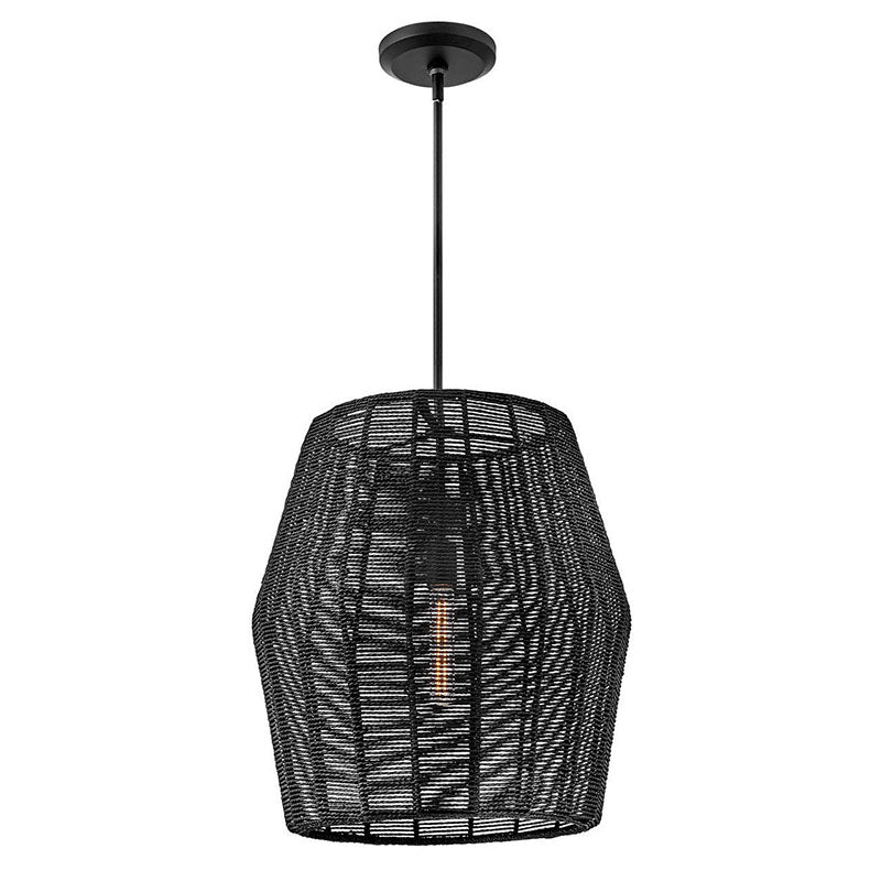 Luca's coastal vibe is permeated with a slightly exotic edge. The bold pendant showcases a robust, woven drum shade, and a full finished cluster for plenty of functional light offered in either Black with Black shade, Polished Chrome with Natural shade, or Black with Camel shade. Luca is part of the Lisa McDennon Collection.