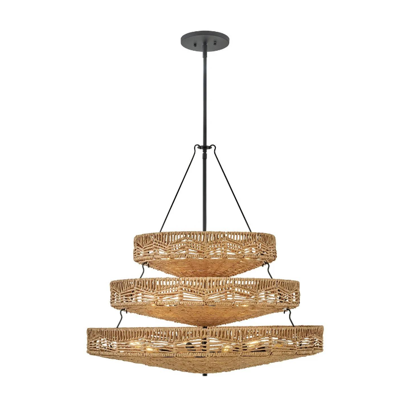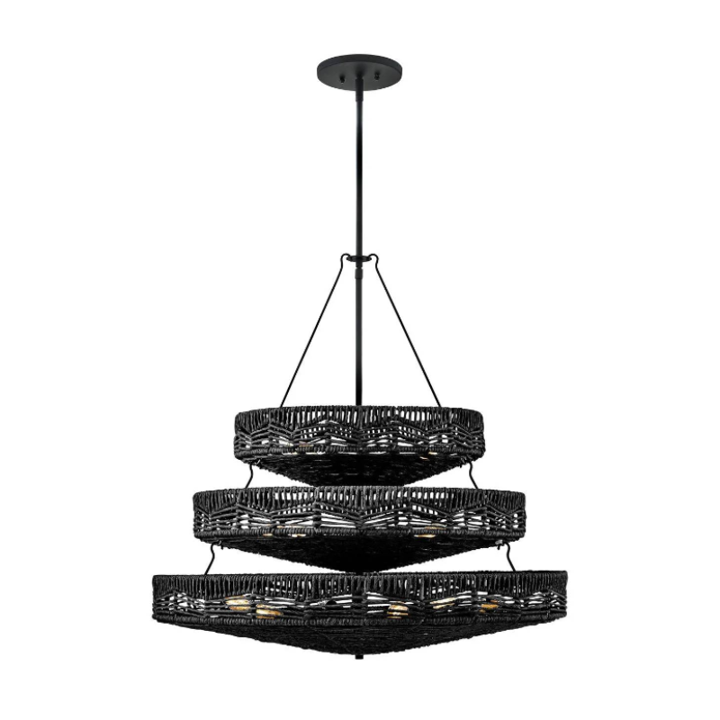 This dazzling design offers striking illumination through a beautiful handwoven pattern. Ophelia radiates with organic elegance as a natural shade adorns a tiered basket frame finished in Black.