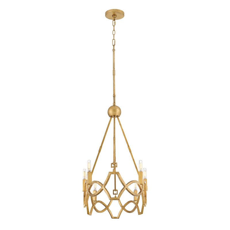 Leona's decorative scrollwork is crafted from a gently curved, smoothly welded frame finished in hand-leafed Distressed Brass. Clean shapes complemented by exposed candelabra lamps create a family of formal fixtures with undeniable charm.