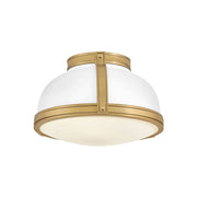 Timeless with a classic equestrian aesthetic, Barton's metal dome shade with double-strap design is available in Matte Black, Matte White, or Gloss White with Navy finishes complemented by Lacquered Brass and an etched opal glass diffuser.