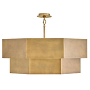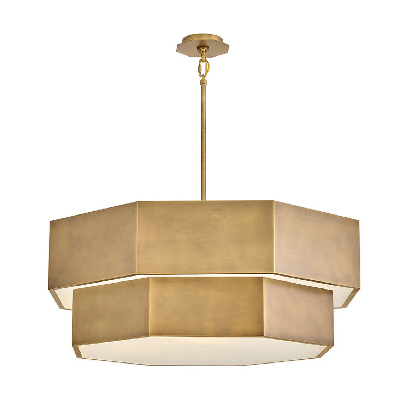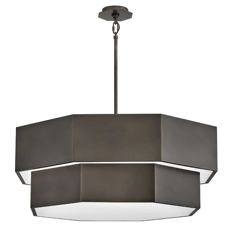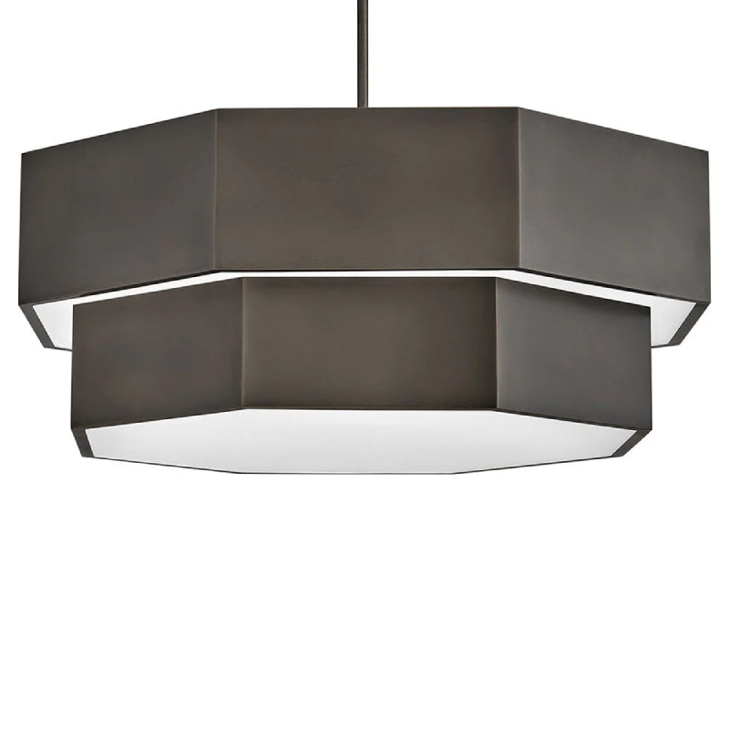 View the many sides of Facet. Interesting angles combine with bold metal features to create an edgy and contemporary profile that is unpretentious yet unforgettable. Hexagonal etched glass is showcased by Heritage Brass or Black Oxide finishes.