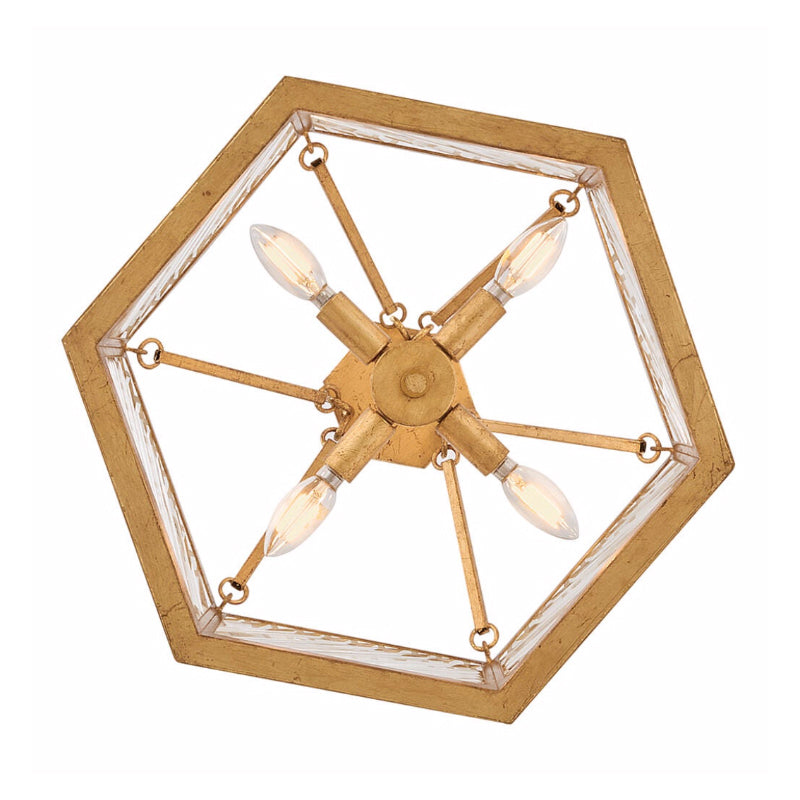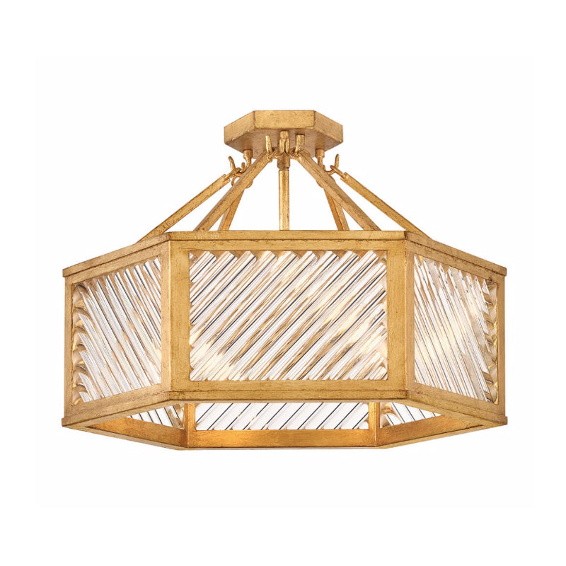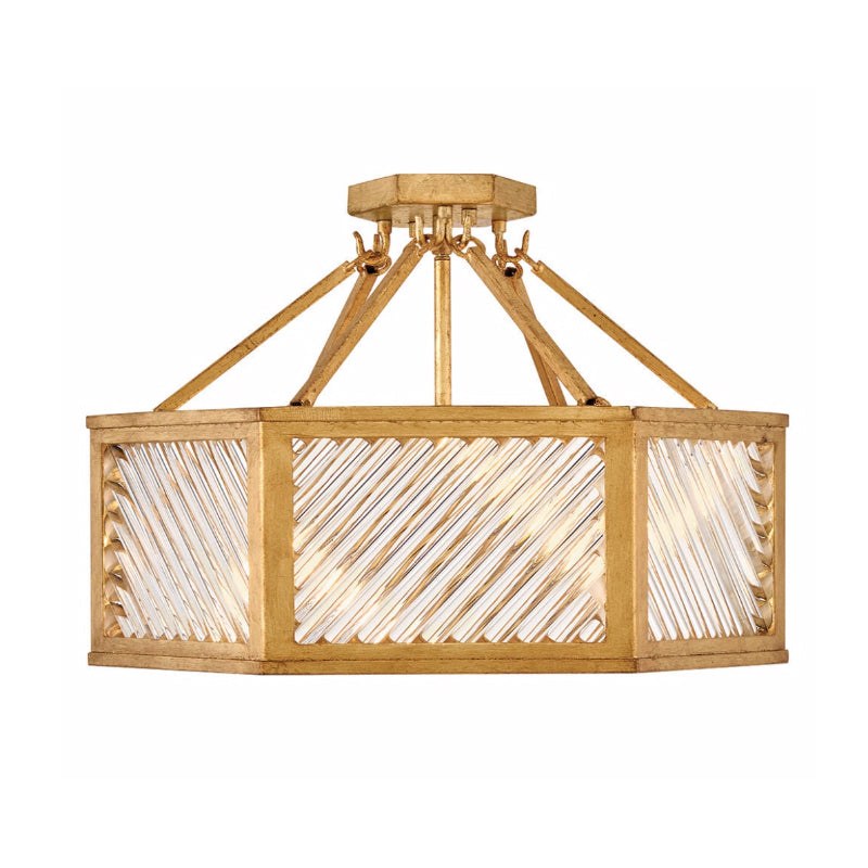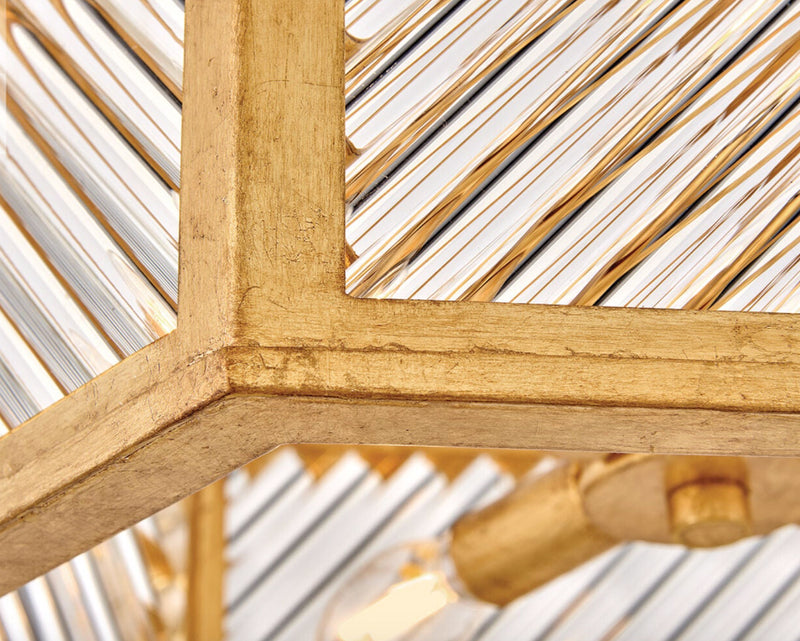 A reimagining of vintage designs from the 40s and 50s, Sura’s transitional, hexagonal Distressed Brass frame creates a glamorous yet understated and tailored appeal. Cylindrical glass rods set at alternating angles echo a soft herringbone pattern, juxtaposing geometry within geometry. Layered details create a reeded effect that is reflective and alluring.