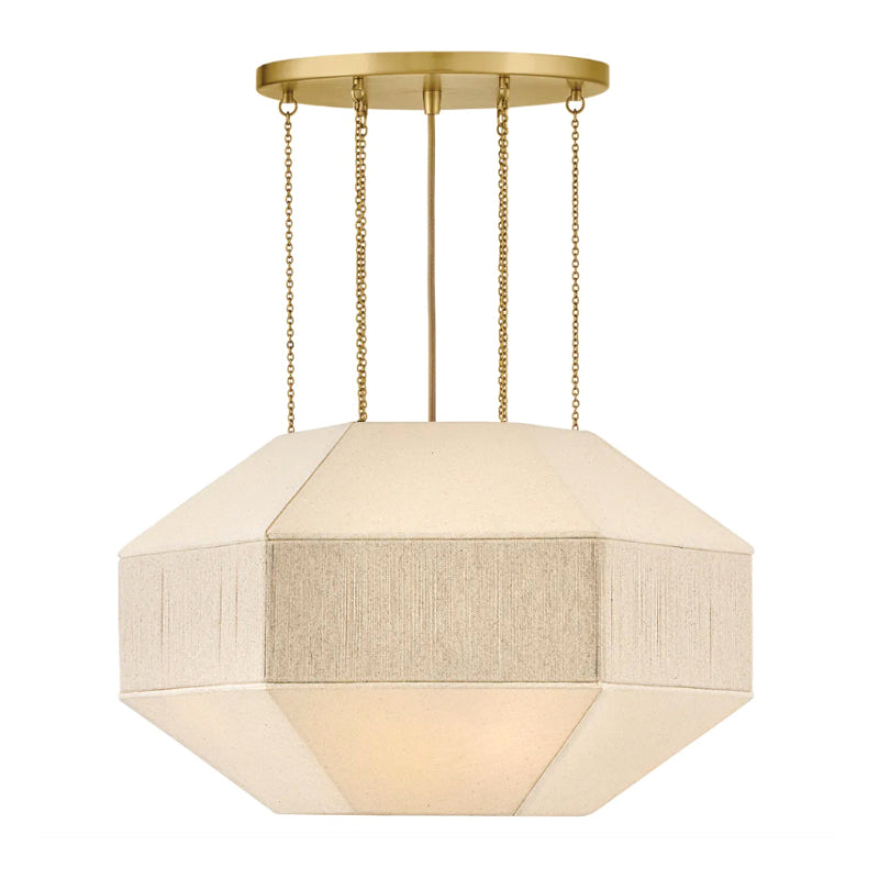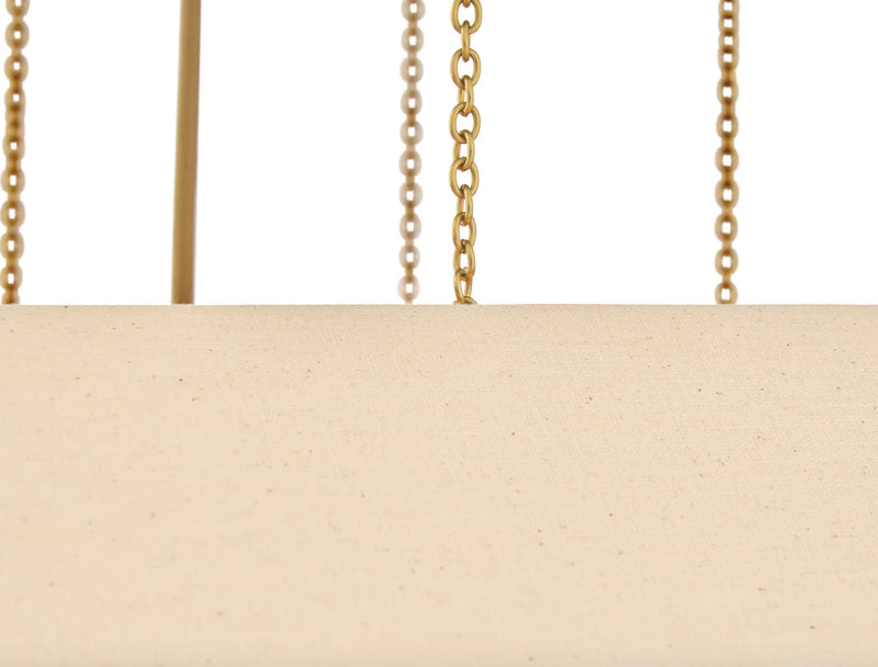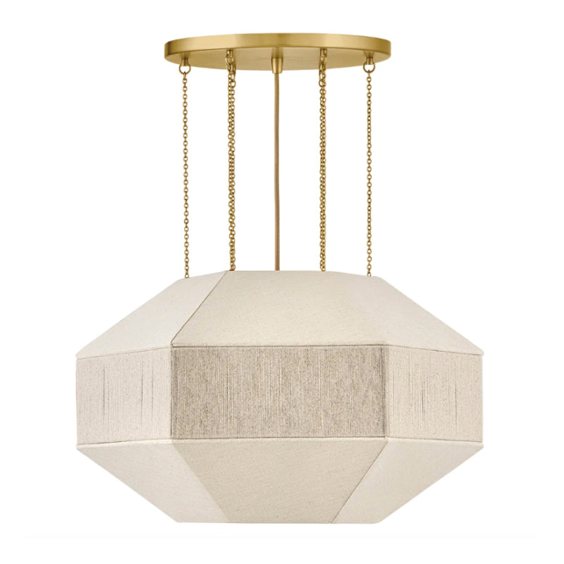 Elegant yet edgy, Lyla’s geometric Oatmeal Linen shade with a textured, wrapped middle band is suspended from refined Lacquered Brass micro-chains – inspired by delicate jewelry designs. A Lacquered Brass canopy, dimmable lamping, and etched white glass diffuser add subtle warmth and a sophisticated atmosphere to the surrounding space.