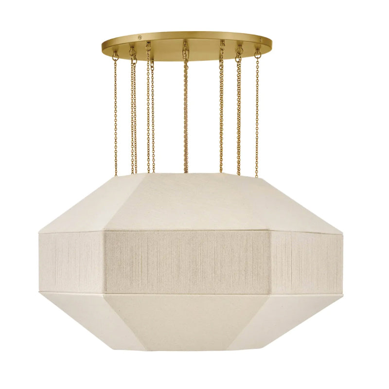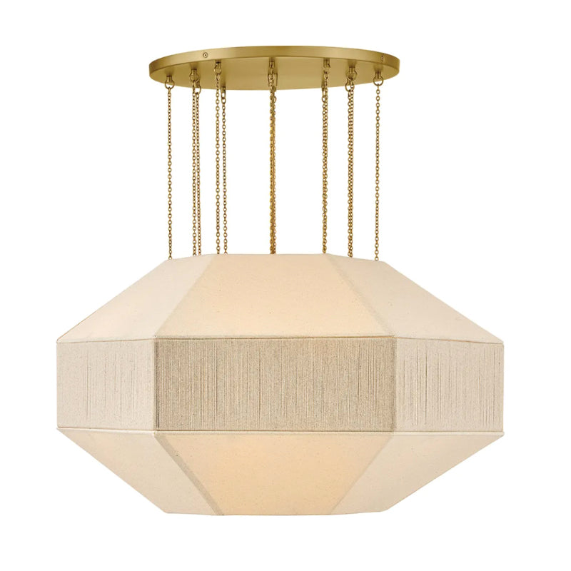 Elegant yet edgy, Lyla’s geometric Oatmeal Linen shade with a textured, wrapped middle band is suspended from refined Lacquered Brass micro-chains – inspired by delicate jewelry designs. A Lacquered Brass canopy, dimmable lamping, and etched white glass diffuser add subtle warmth and a sophisticated atmosphere to the surrounding space.