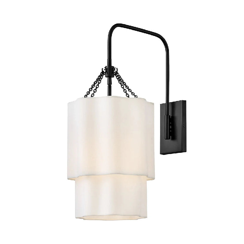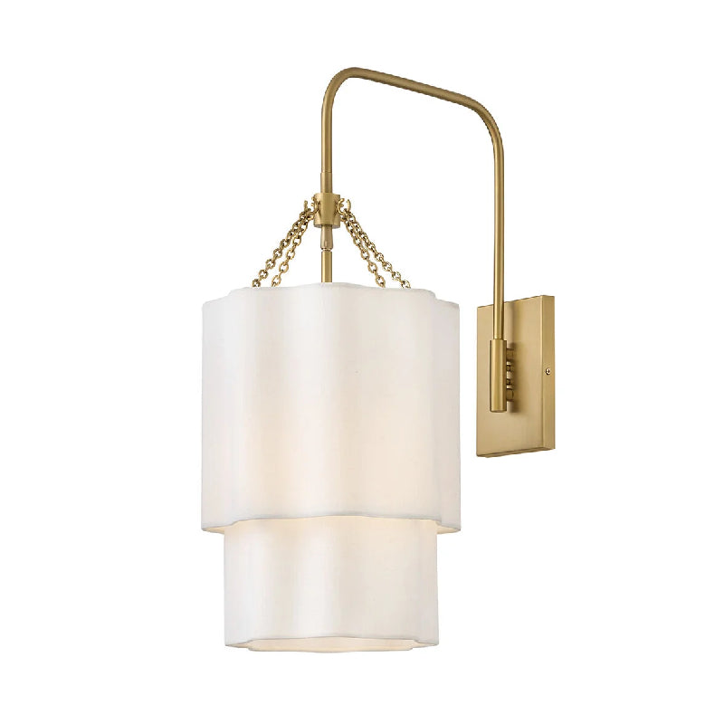 Splendidly soft, Gwen’s shapely scalloped shade complements inviting light with elegant layers of off-white linen suspended from delicate chains and minimal metal stems. A Black or Lacquered Brass finish provides a versatile complement to any interior style.