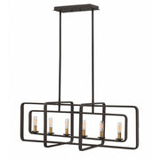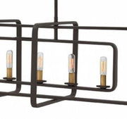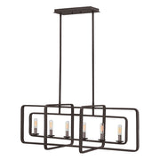 Quentin is constructed of angular forms that create a striking geometric interplay. This stem-hung collection features intersecting rectangles in a bold Buckeye Bronze finish, forming a modern silhouette. Candle sleeves in Heritage Brass add a distinctively vintage feel that is both hip and historical.