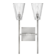 Sleek and feminine, Auden showcases a dramatic minimalist design with refined details. Thick clear glass shades gleam against elegant, elongated stems and a sleek square backplate. Auden's streamlined silhouette adds understated yet upscale sophistication to any interior space.