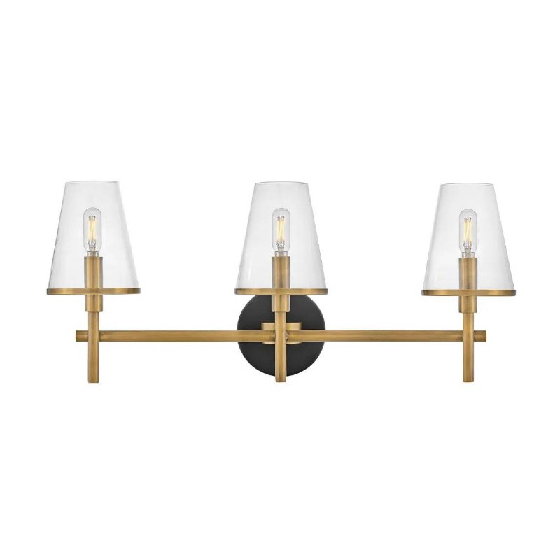 Marten has a clean, crisp look that brings striking transitional elements to any décor style. Clear glass shades have a Heritage Brass rim, perfectly complementing the Black back plate to tie the aesthetic together. The clean lines provide the satisfaction of balanced symmetry while giving off ample light.
