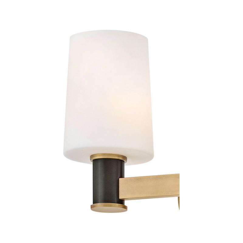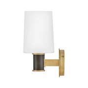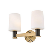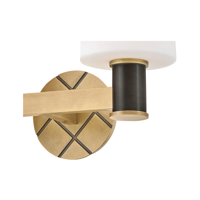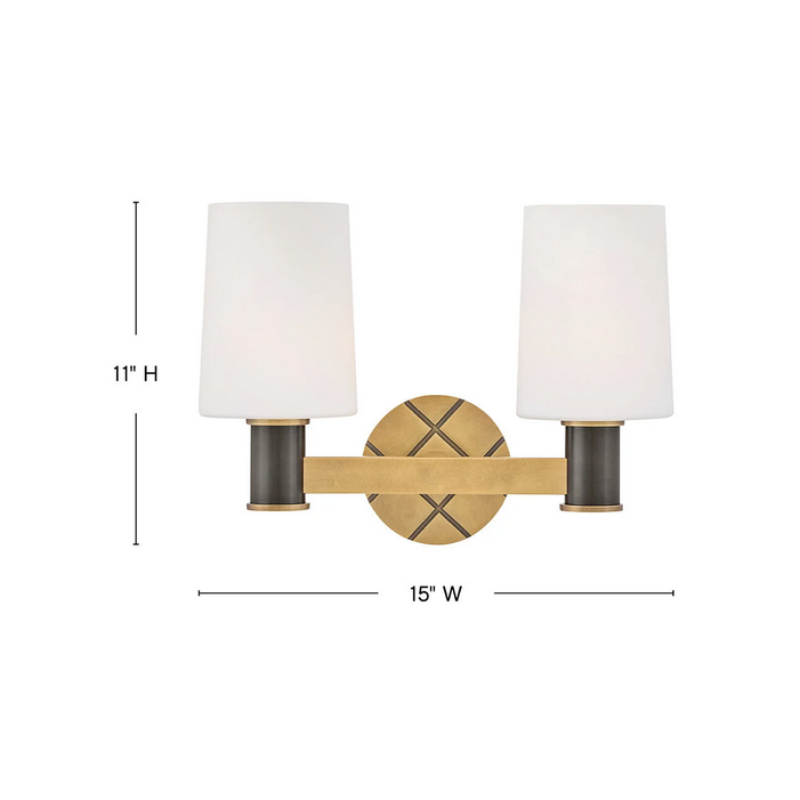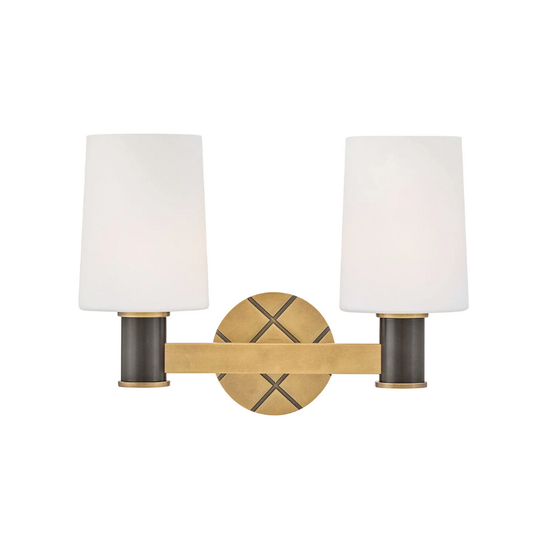 Featuring a geometric, crosshatch motif, Declan’s substantial silhouette is enhanced by a heavy cast backplate and stem accentuated by a contrasting, two-tone finish. Tall, tapered, etched opal glass shades create softly diffused illumination and a comfortable atmosphere.