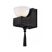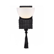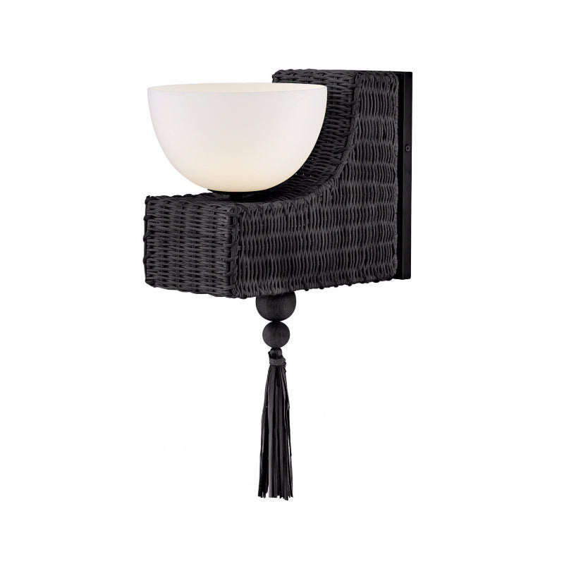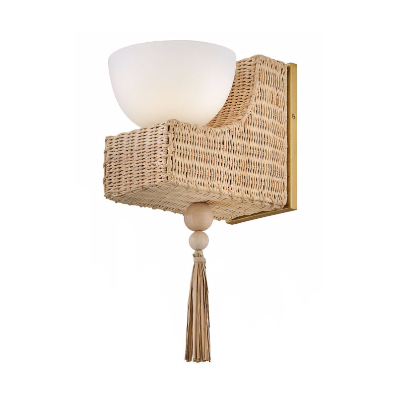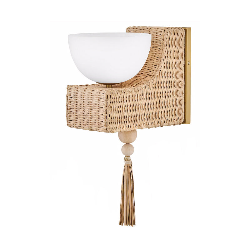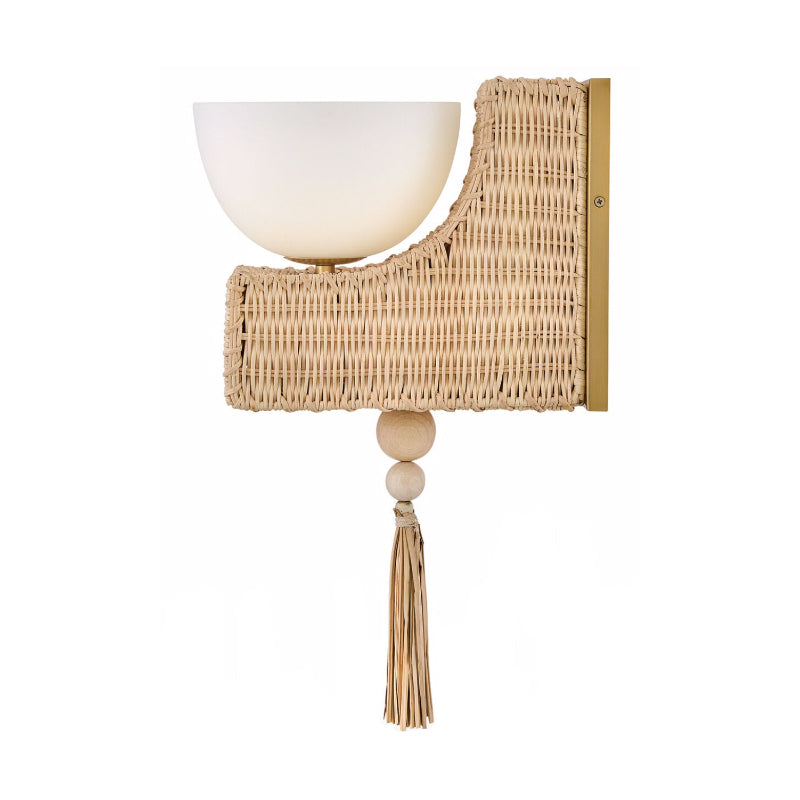 Named after a beach in Laguna, California, marked by a single, large palm leaf umbrella in the sand – Thalia’s distinctive, whimsical woven design evokes the relaxed, carefree spirit of coastal living. Natural raffia is complemented by a shallow opal glass bowl, and a playful tassel adds a fun bohemian touch that can be removed for a more streamlined look.