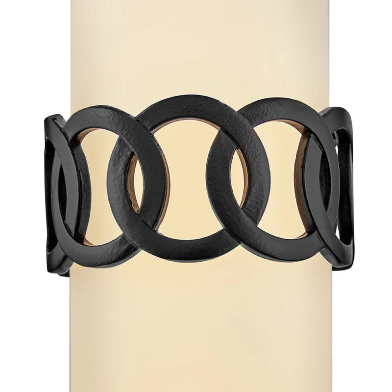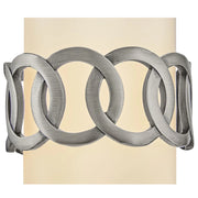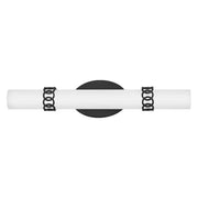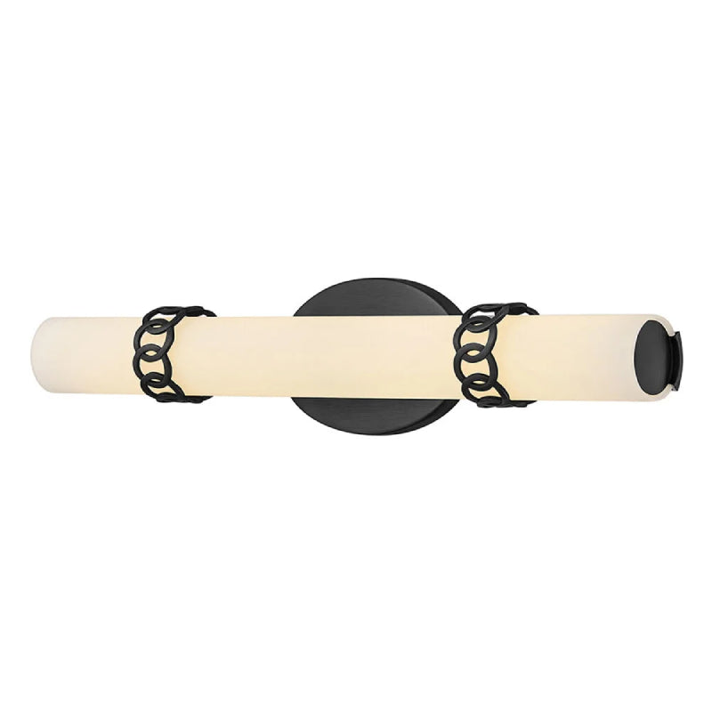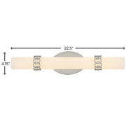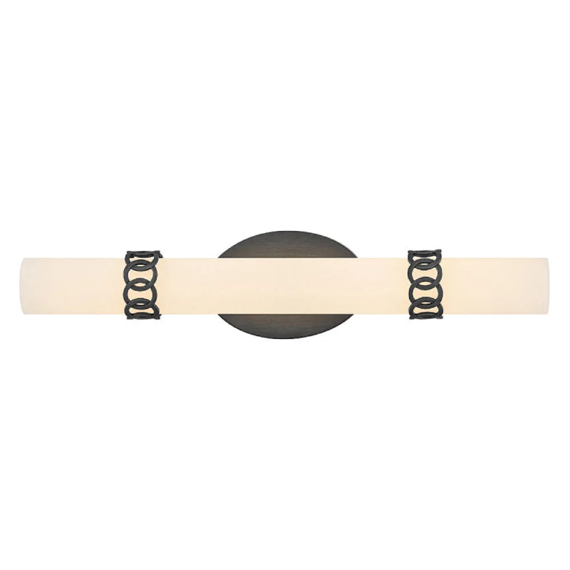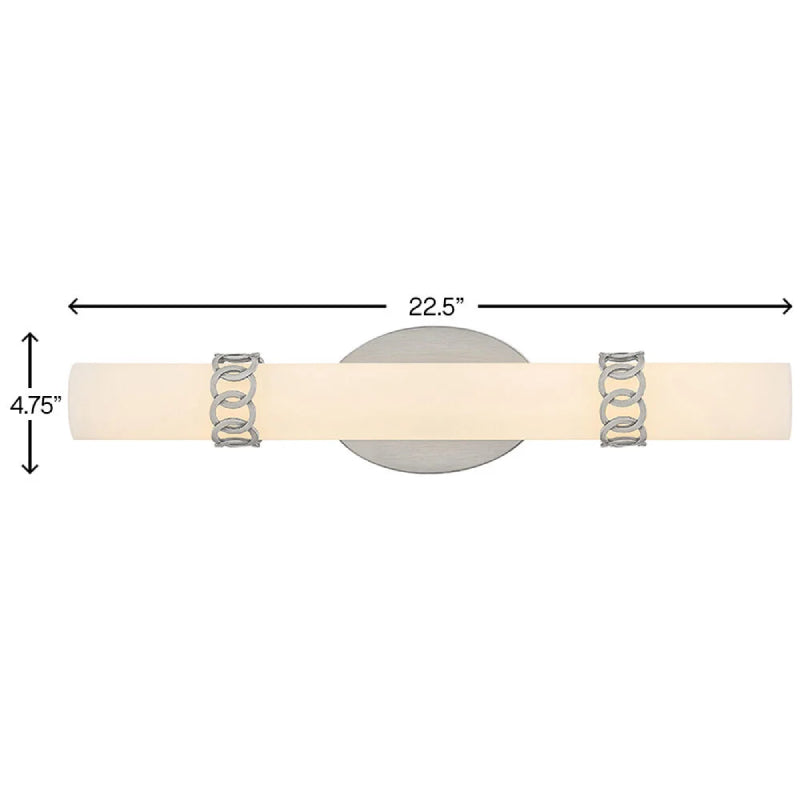 Reminiscent of the fanciful detailing found in fine jeweled bracelets, Eliza’s decorative chain cuffs accentuate its tasteful etched opal glass. Fully dimmable integrated LEDs evenly cast bright yet comfortable illumination to fill your entire bathroom or living space.