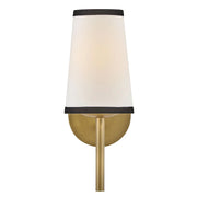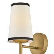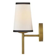 A take on traditional sconce styles, Sonia’s tapered shades feature contrasting top and bottom binding. The chic metal frame and accents are finished in versatile Lacquered Brass to complement any color palette.