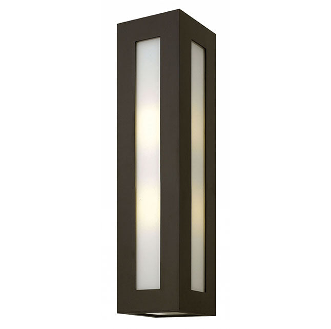 Dorians robust design in durable aluminum construction is offered in Bronze finish. This contemporary fixture allows light to emit from white etched glass windows.