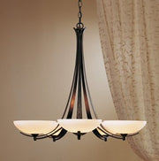 The hand-worked ribbons and pipes of steel paired with elegant glass bowls give this design a transitional twist. The 5-arm Aegis Chandelier is a beautiful addition to a range of design styles. Formed by artisans at our forge here in Vermont, each piece is unique.
