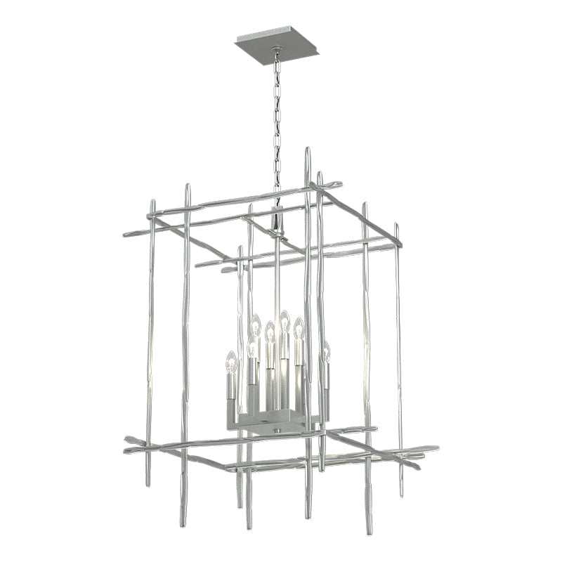 The Tura 8-Light Large Chandelier is the perfect focal piece for your dining room, foyer, great room or any living space. The chandelier has candelabra bulbs and an intersecting perpendicular structure of individually hammered aluminum pieces that look like organic twigs from nature.