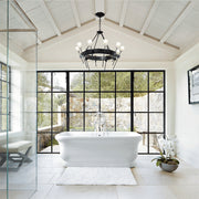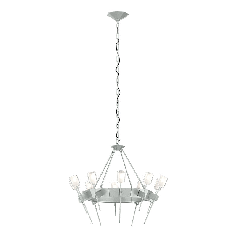 The Echo 10-Light Circular Chandelier combines both faceted and pure geometric forms, blending clean and gothic architectural elements. Rough, forged “hands” gently holding a delicate glass flower served as inspiration for the individual elements of this piece. Thick, frosted glass is perched on each delicate stem.