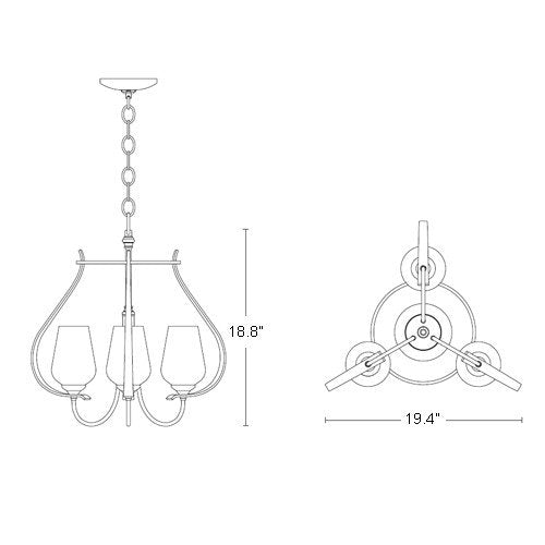 This three-armed chandelier showcases our Vermont forge work. From the circlet crowning the piece, to the bands swooping down, to the round bars that sprout the glass, the hand-shaped steel delivers curve after curve.