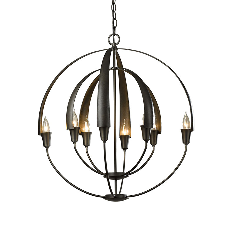 There's no need to make a choice between form and function - as part of the Cirque Collection, this large chandelier delivers both. Two concentric orbs are hand-forged into eight tapered steel petals merging at the sculpture's apex.