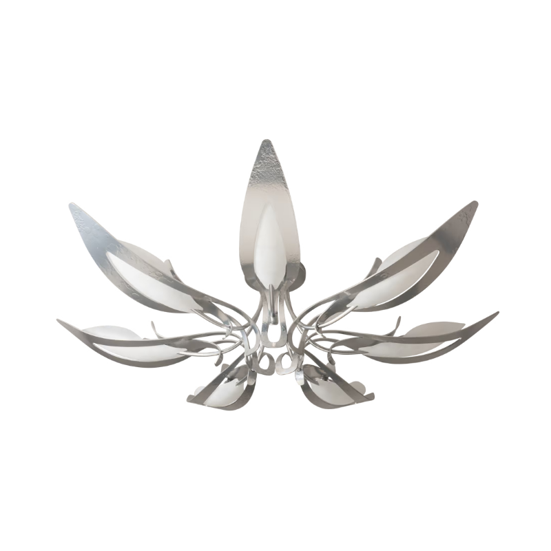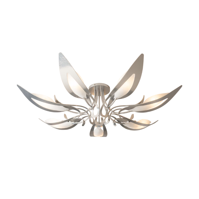 A beautiful way to illuminate any room, the Parasol semi-flush fixture is both delicate and impressive. Each arm was designed to nest a piece of slumped art glass to great effect. According to HF designer Jason Hancock, a "milky" candelabra bulb is the ideal choice to give this fixture the most elegant look.