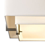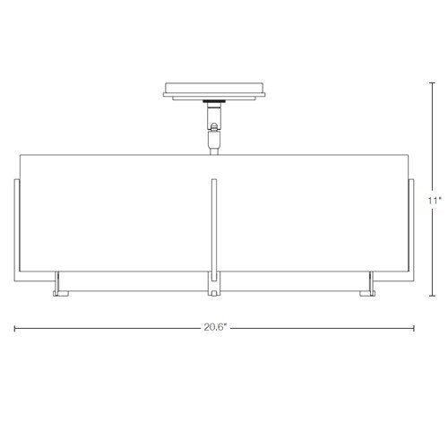 This semi-flush ceiling light features four bulbs within two shades. The shades are cradled by four hand-forged steel bars creating a bold contrast with the bars' vertical lines set against the horizontal planes of the shades.