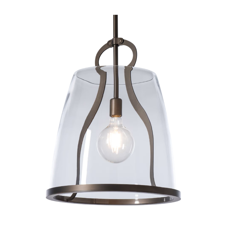 This large Caliper Pendant gives scale to our popular design. At over 16" in diameter, this Caliper is large enough to hang as a single fixture in a breakfast nook, or a double over most kitchen counters. With the metal feature designed to resemble an antique tool, the Caliper's large glass shade is supported by this "tool" and lower metal rim.