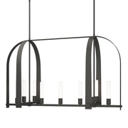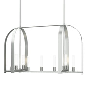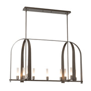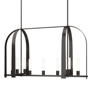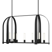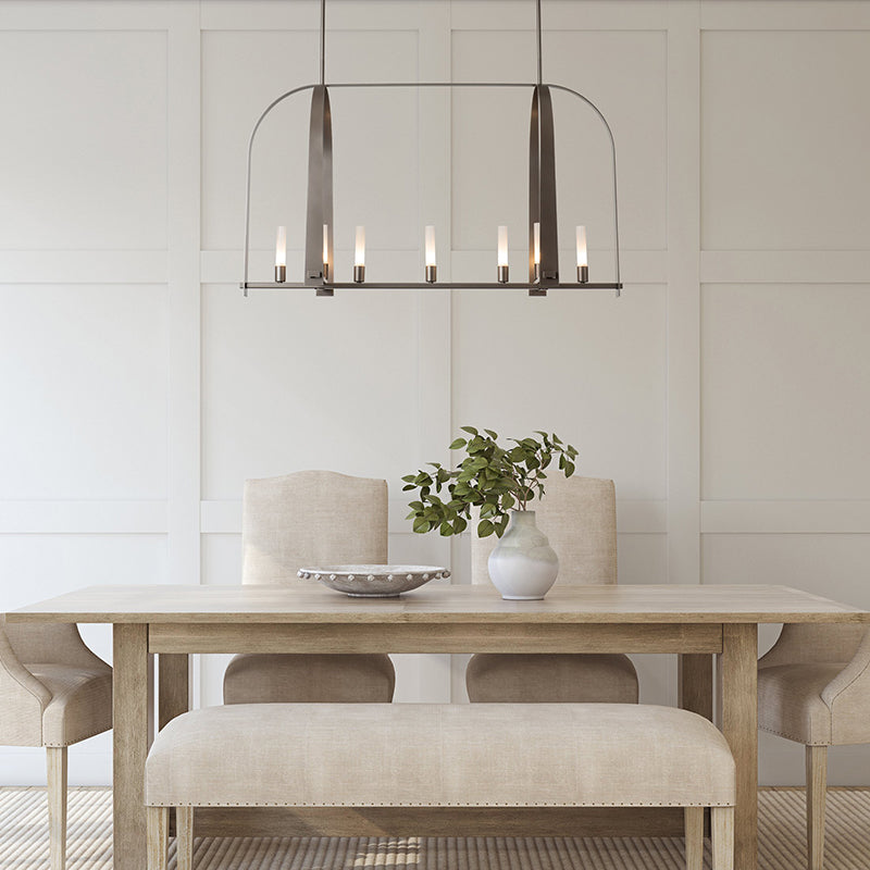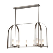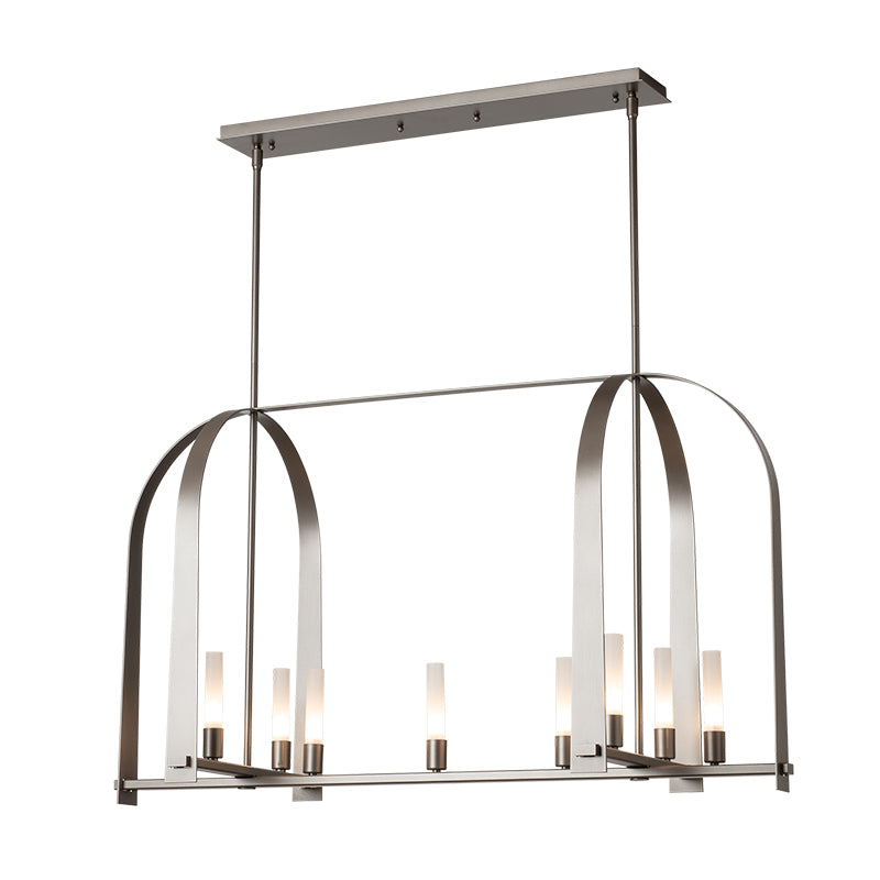 The Triomphe 9-Light Linear Pendant is a geometric, linear design features intersecting arches with a distinctive shape. The Triomphe takes its inspiration from traditional cage chandeliers, but with contemporary design touches that give it an open feel. Handcrafted of steel, it features two sets of intersecting arches, with frosted glass tubes fitted to the steel traverses with Craftsman tenon details.