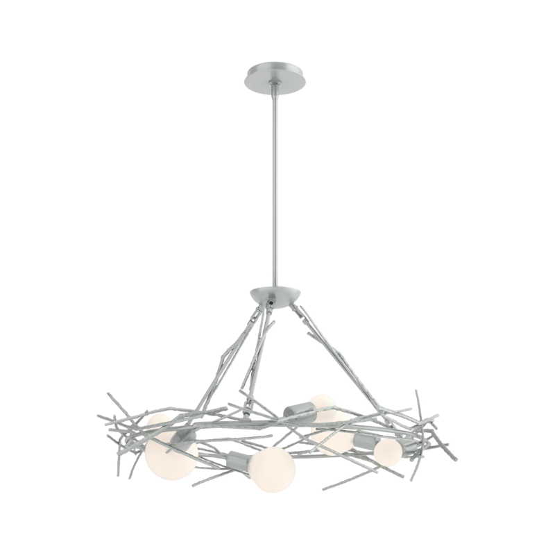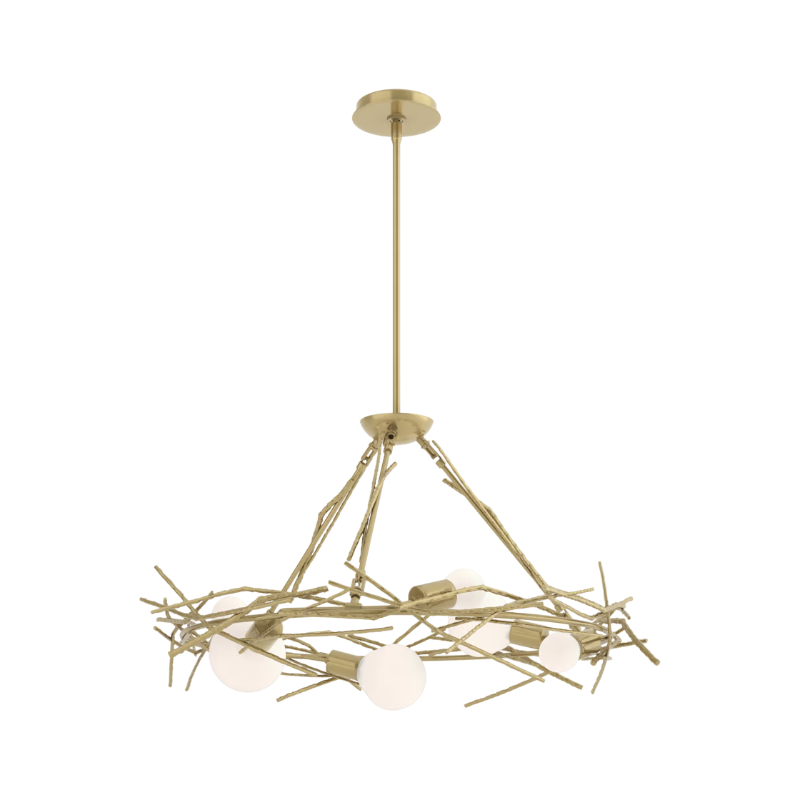 The Brindille Collection is known for its hammered metal “twigs”, inspired by nature’s bountiful Vermont forests. HF’s longtime head of design, David Kitts, “wanted to take our classic hammered Brindille elements and bring them into a more contemporary setting form, scale and light source” in creating the 6-Light Circular Pendant.
