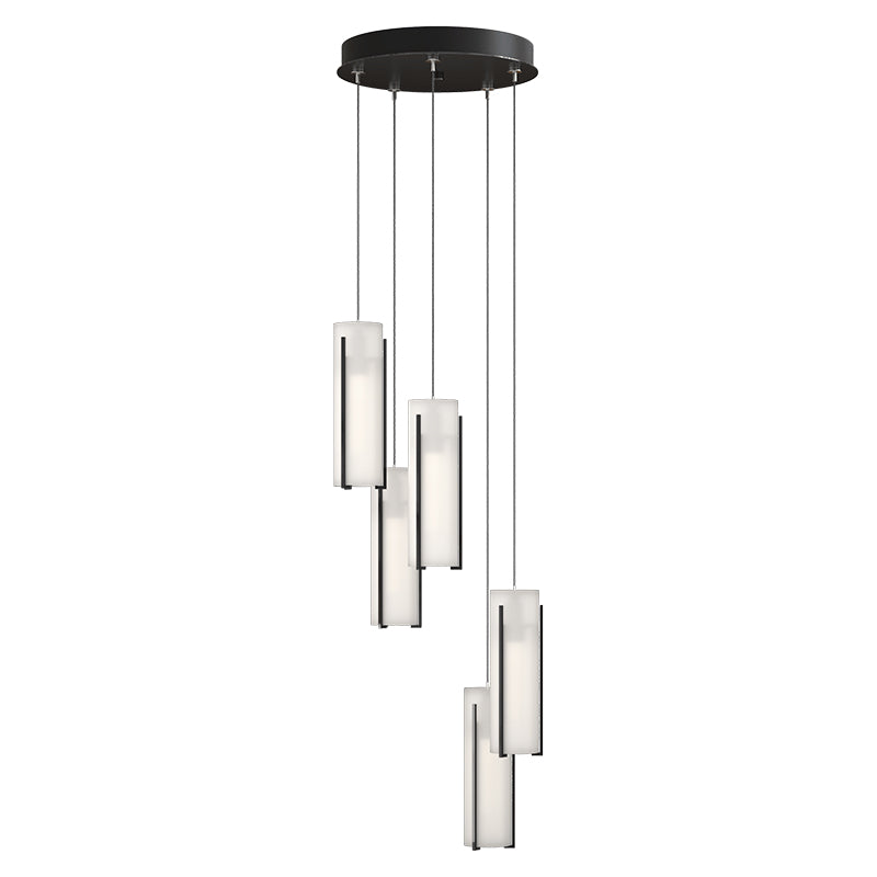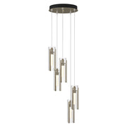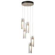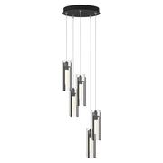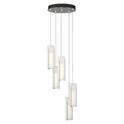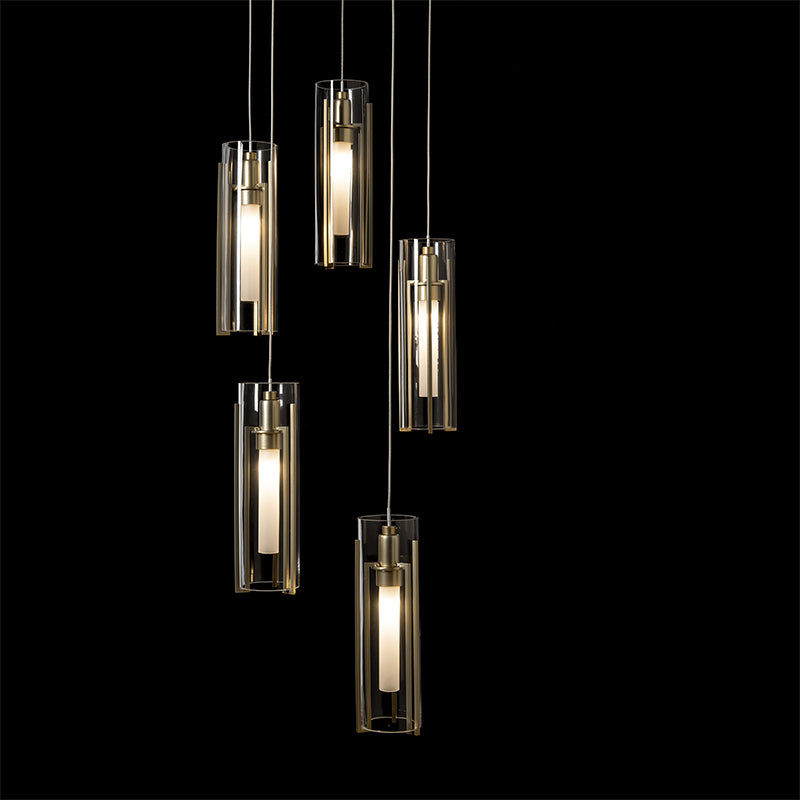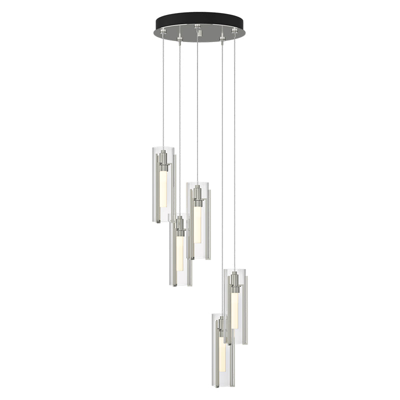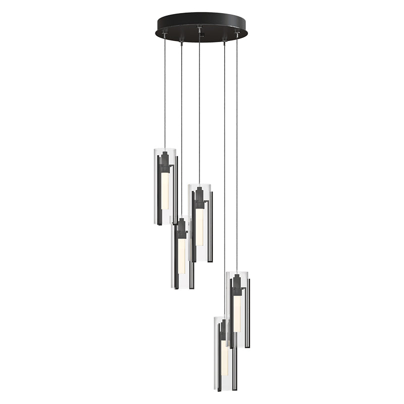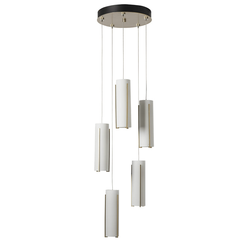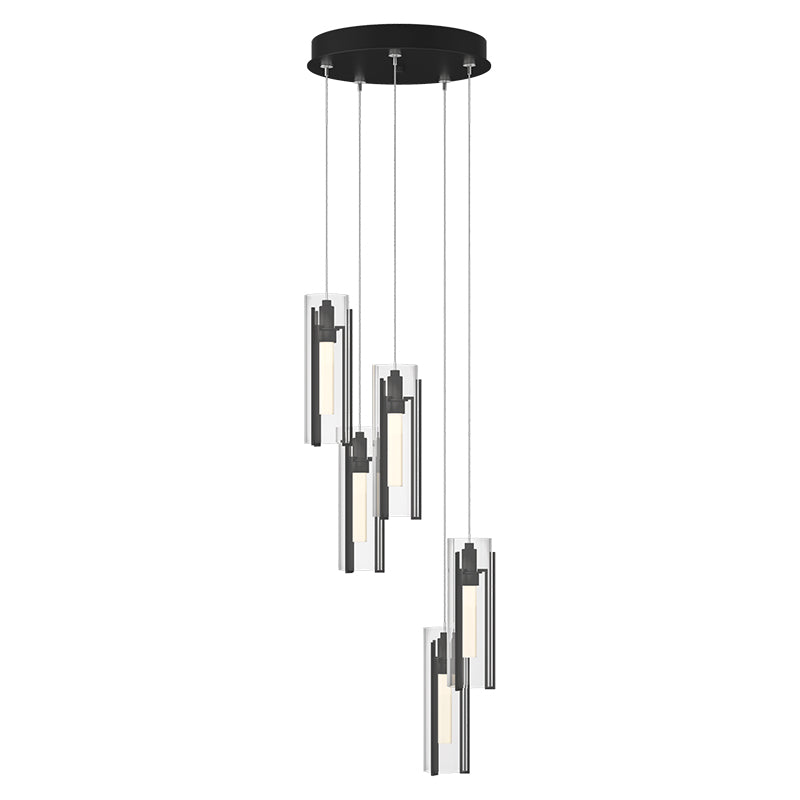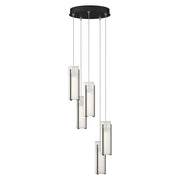 The Exos Collection has a new addition with five cascading pendants clustered on a round multi-port canopy. Individual pendant lengths are customizable to suit the space, making this Exos Glass 5-Light pendant and easy choice.