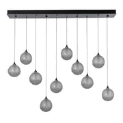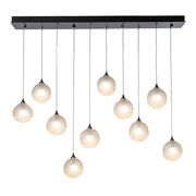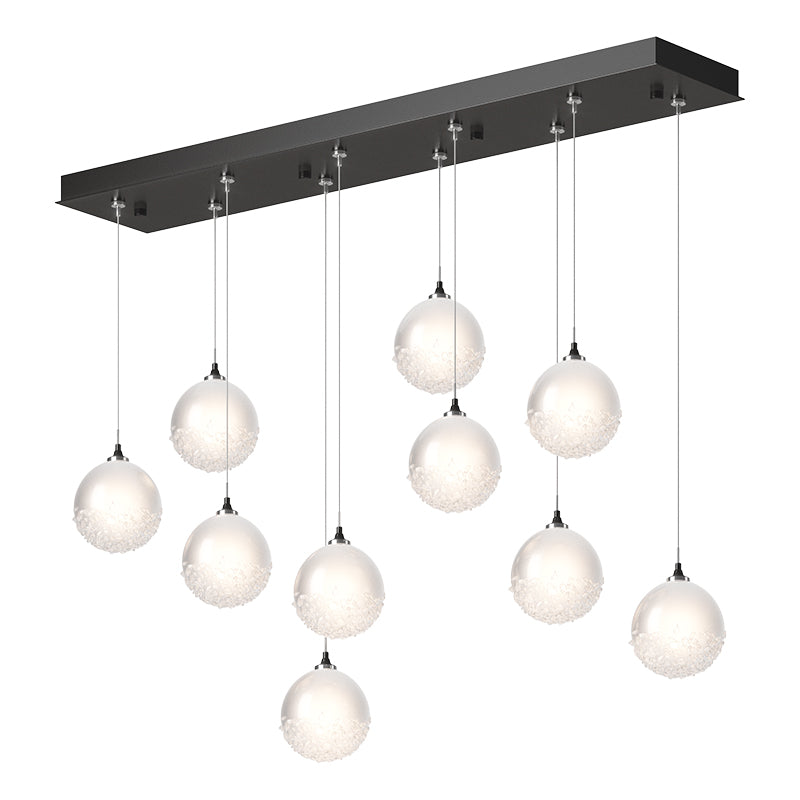 The Fritz Globe 10-Light Pendant is a stunning ceiling fixture that will add a touch of elegance to any space. The ten glass spheres are etched on the inside to provide more diffuse light, and the bottom of the outer glossy surface is covered in a heavily-textured fritted glass. This multi-port lighting fixture with its rectangular canopy allows you to customize the lengths and positions of each individual pendant, from aligned to staggered for effect.