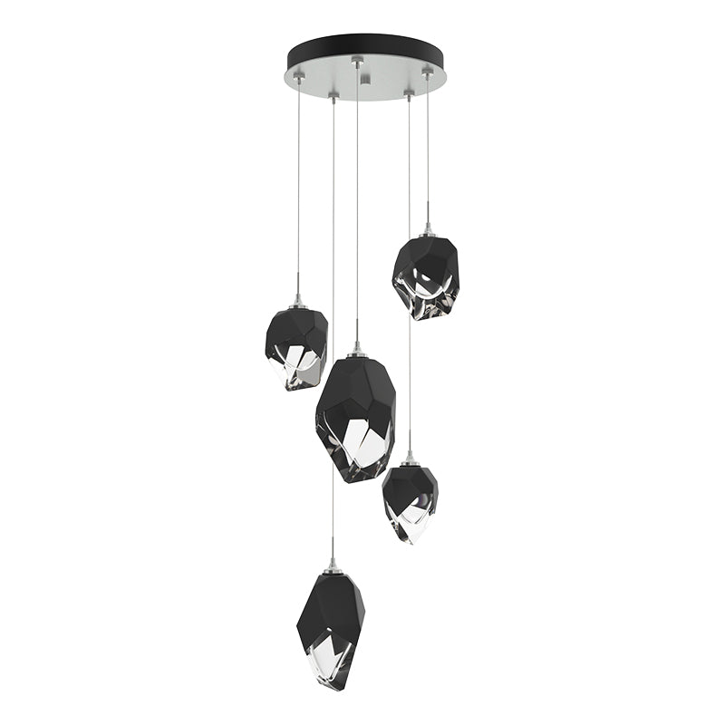 The Chrysalis 5-Light Mixed Crystal Pendant is a multi-port fixture that features five (2 large + 3 small), handcrafted faceted blown glass elements suspended from a round canopy.