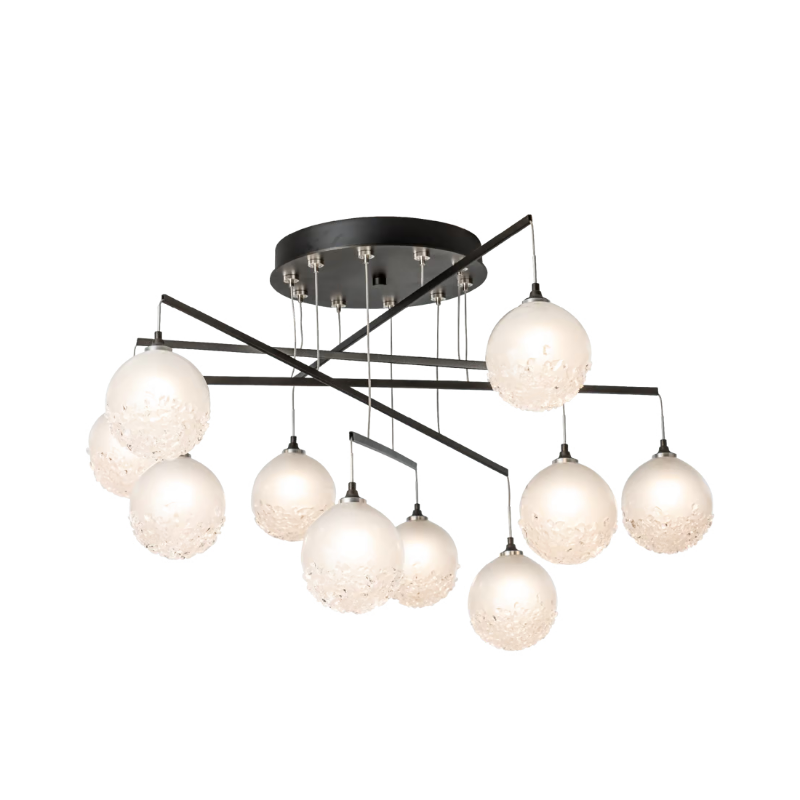 A beautiful way to illuminate any room, the Parasol semi-flush fixture is both delicate and impressive. Each arm was designed to nest a pieced of slumped art glass to great effect. According to HF designer Jason Hancock, a "milky" candelabra bulb is the ideal choice to give this fixture the most elegant look.