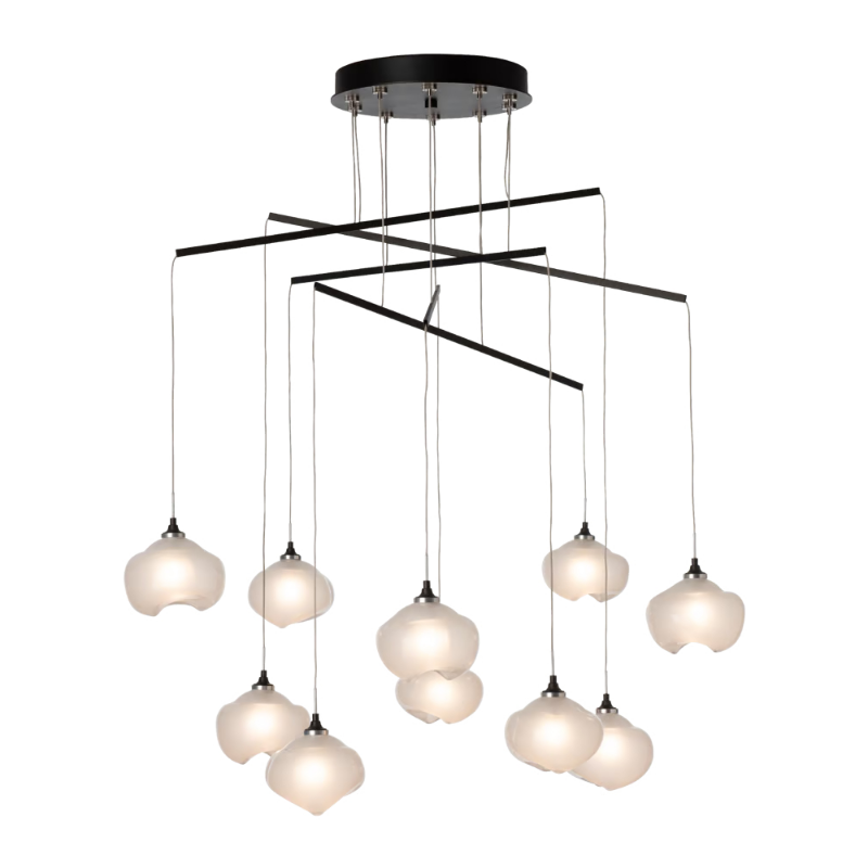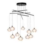 This Japanese flower's delicate aesthetic, the Ume expands its reach with a mobile platform, with highly-adjustable cables enabling unique and custom designs for any space. Delicate metal tubes guide the cables to artfully balance the glass elements. Each Ume "blossom" has a trademark glossy outer and frosted inner surface for a unique allure.