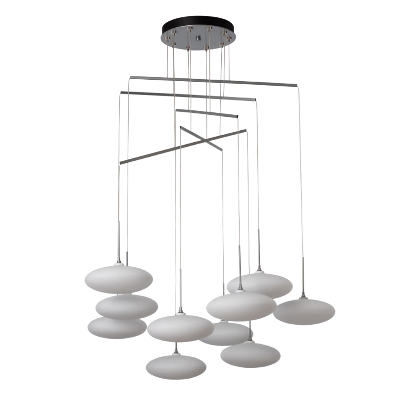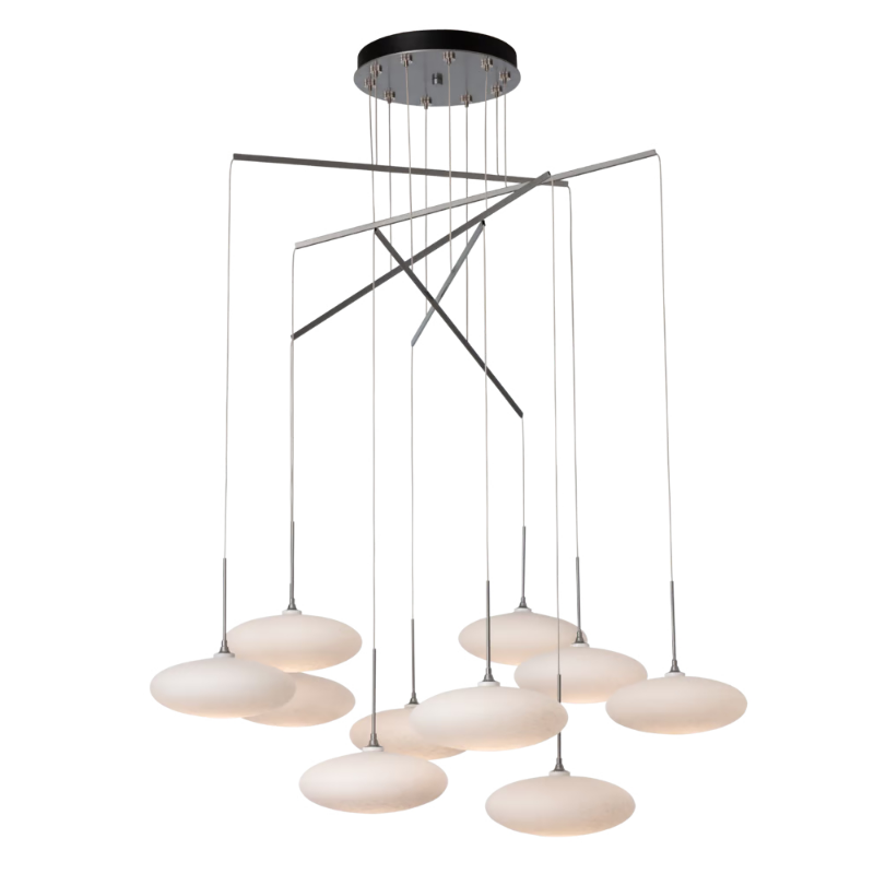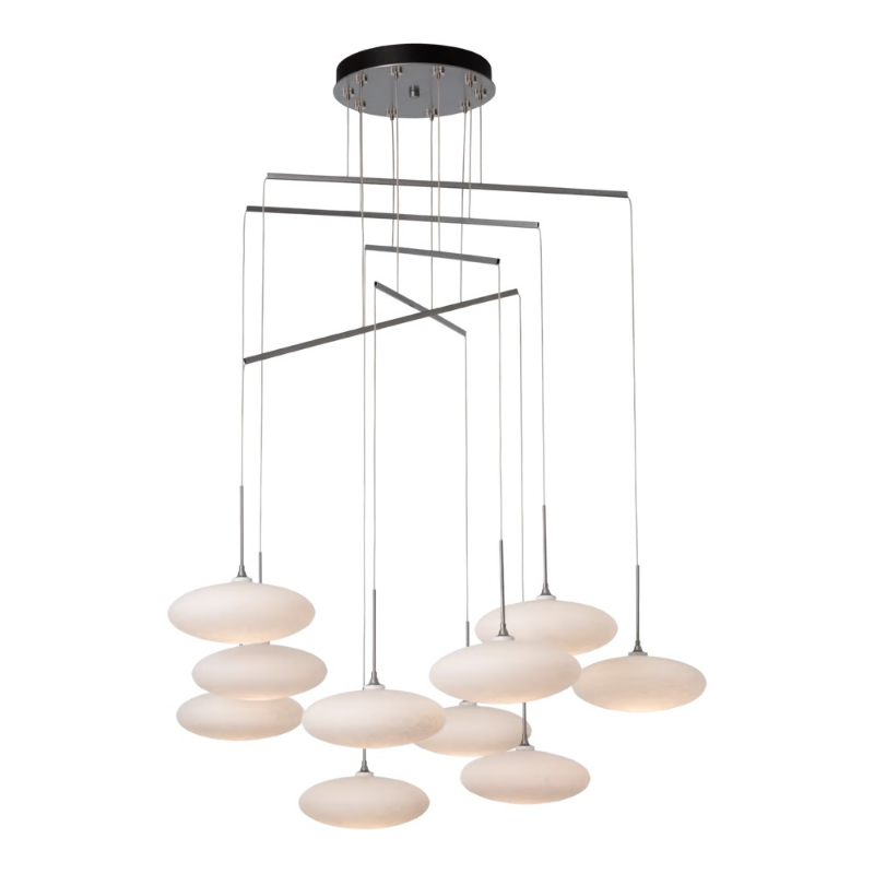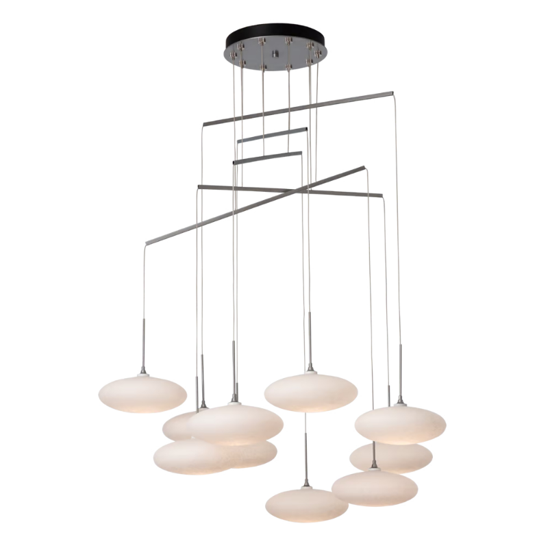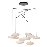 Beautiful white tortoise shell-like glass is shaped in a squashed sphere in this unexpected design resembling a cluster of clouds. Each piece of glass is cable-hung via a mobile created with delicate metal tubes allowing for a highly-adjustable design. The canopy is minimized while the breadth is expanded in an artful display of light.