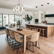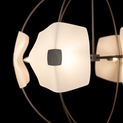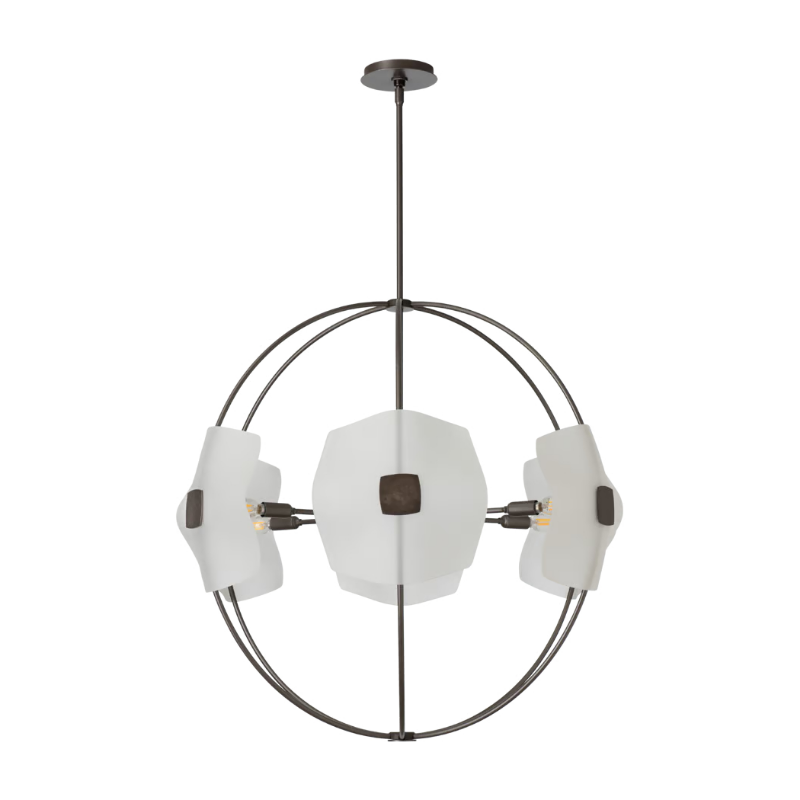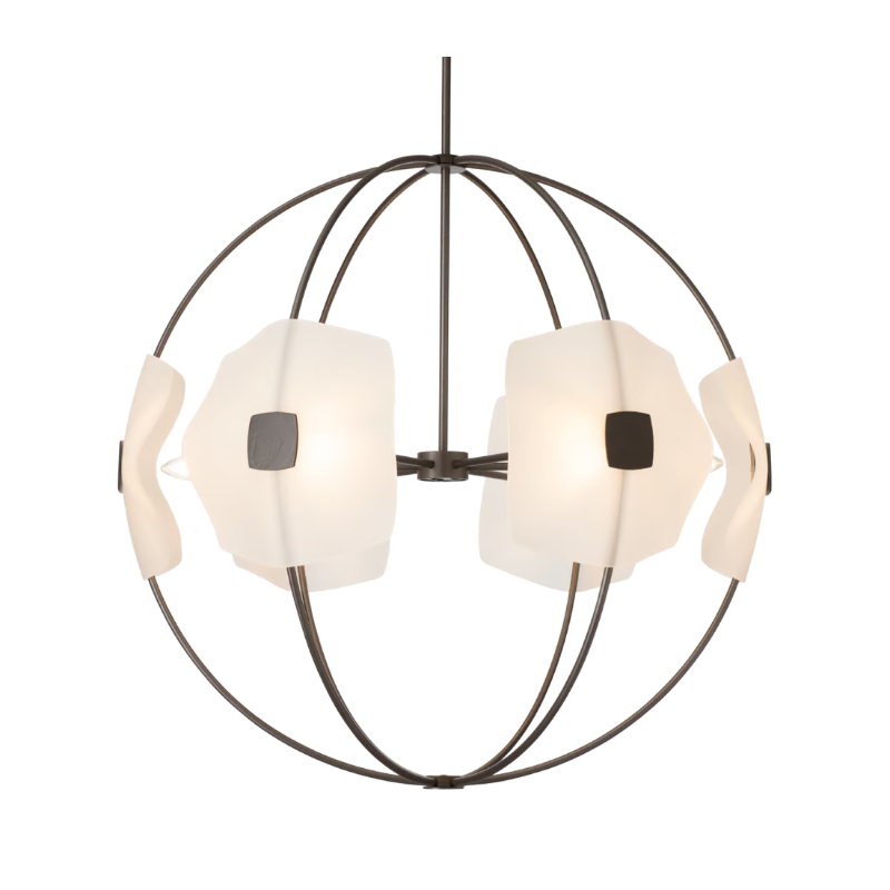 The six light Astra Orb Small Pendant features gently slumped handmade glass, complementing each curved metal arm of the fixture. Each stunning piece of glass is held in place by a hand-forged medallion for a sophisticated look.