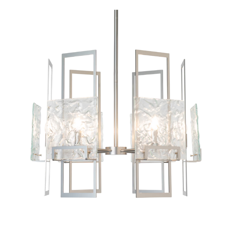 A juxtaposition of unique textured clear glass elements with tall vertical modern steel structures achieved the clean, contemporary lines that designer Ori Goldberg was seeking. The Geo 6-Light Pendant is perfect either alone or in multiples, making it easily adaptable to many spaces.