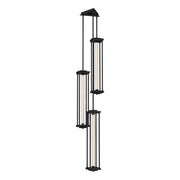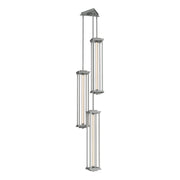 The Athena Triple Tall LED Lantern features a trio of tall LED cylinders, each suspended via independent, height-customizable stems from a small, triangular canopy. Fluted, clear glass tubes over opal glass cylinders house the vertical LED elements. These modules are suspended between conductive perches at each end within contemporary, open metal structures.