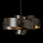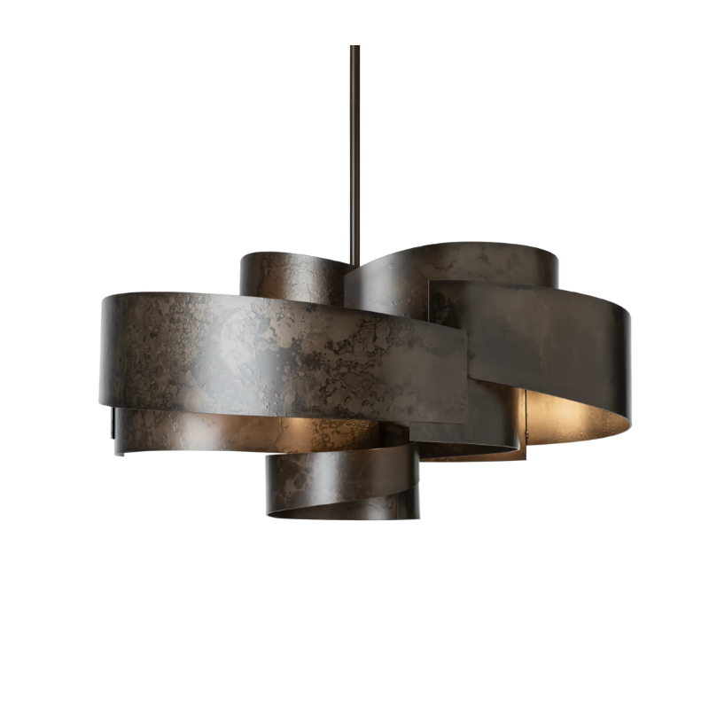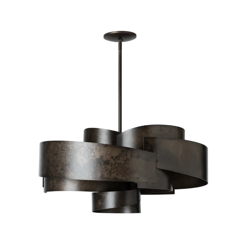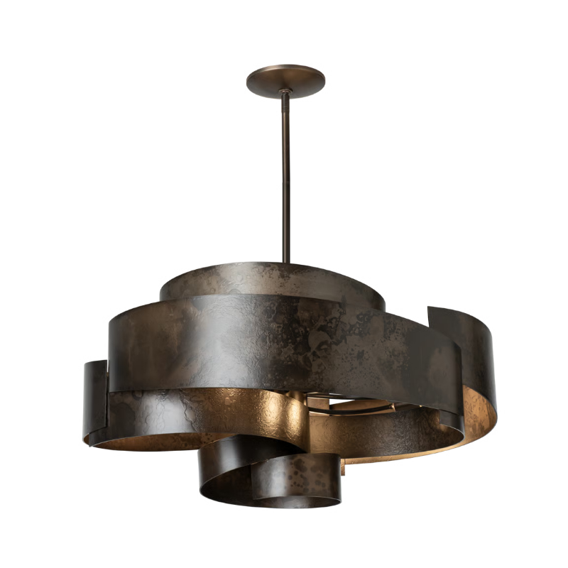 Like the ancient flow of a silk sleeve to block the sword of an aggressor, the movement and flow of the Zen Pendant's wide steel swirl is mesmerizing. The hand-forged and textured steel glows from the lights within, allowing them to play across the hand-shaped metal's interior surface. The work of Vermont artisans is palpable in this stunning and substantial piece.