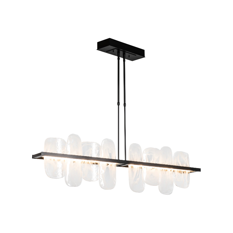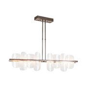 Exquisite, thick, handmade glass features abstract white "swirls" that command attention. The Vitre Large Linear LED Pendant is perfect over a dining table, large island, or even a billiards table. Bright and beautiful, this double-rod lighting fixture's LED light-guide platform creates an up-and-down wash of light, illuminating the stunning glass elements and its environs.