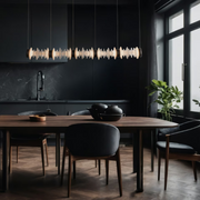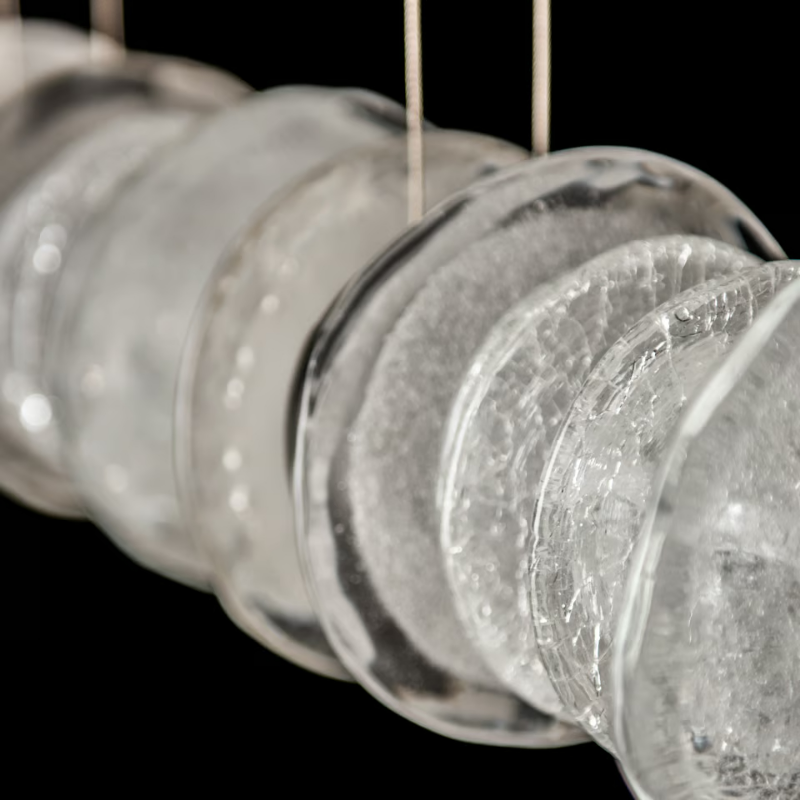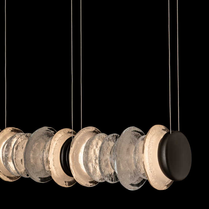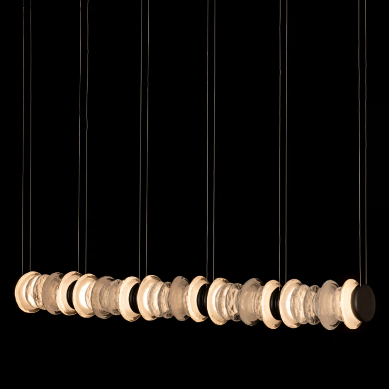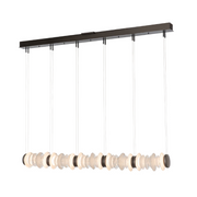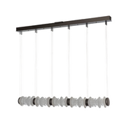 An addition to the Cairn Collection, this pendant tips the vertical glass "stone" stacks to a horizontal in this wonderful linear version. Round, textured clear and bubble glass of varying diameters are positioned side by side. Each of five "stacks" is bookended by metal, stone-shaped LED modules to great visual effect.