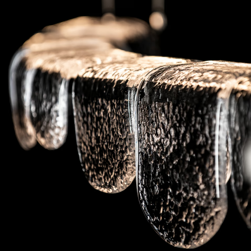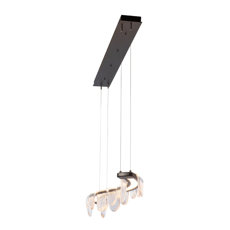 Inspired by the cold icy streams of Vermont that are adorned with ice covered rocks and frozen boulders, this riverbed of light with meandering artisan glass is stunning. Featuring a curved LED light-guide platform, the Riverbed Pendant’s unique, clear, textured poured glass has been formed and shaped like frozen stones along the river’s edge by our local partner, AO Glass, working with HF designer Andy Morter.